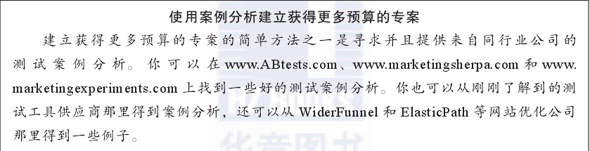 你往往需要為高級(jí)管理層建立一個(gè)案例,以獲得較高的預(yù)算,最好的辦法就是制作個(gè)簡(jiǎn)短的演示文稿供他們審核。為了使這個(gè)演示文稿達(dá)到最佳效果,它應(yīng)該強(qiáng)調(diào)使用測(cè)試工具在第一年中的預(yù)期投資回報(bào)率、潛在的高轉(zhuǎn)化率以及對(duì)高管來說最重要的一一與轉(zhuǎn)化率提升相關(guān)的收入増長(zhǎng)(即使最基本的2%提提升,通通常也會(huì)給收入帶來很大的增長(zhǎng))。