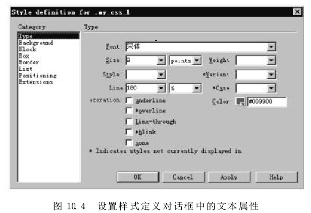 在彈出的"Style Definition(樣式定義)”對話框的"Category" 列表框中,選擇"-Type"項,出現(xiàn)"Type"設置面板,設置my-css-1樣式的各種屬性,如圖10.4所示。