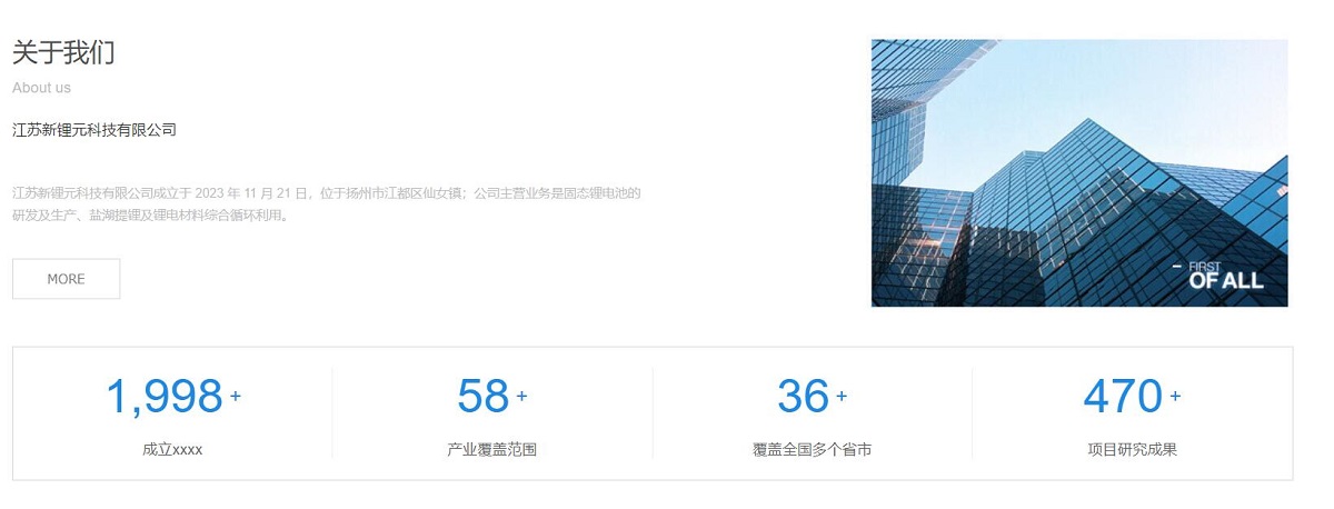 江蘇新鋰元科技有限公司成立于 2023 年 11 月 21 日,位于揚(yáng)州市江都區(qū)仙女鎮(zhèn);公司主營業(yè)務(wù)是固態(tài)鋰電池的研發(fā)及生產(chǎn)、鹽湖提鋰及鋰電材料綜合循環(huán)利用網(wǎng)站建設(shè)。
