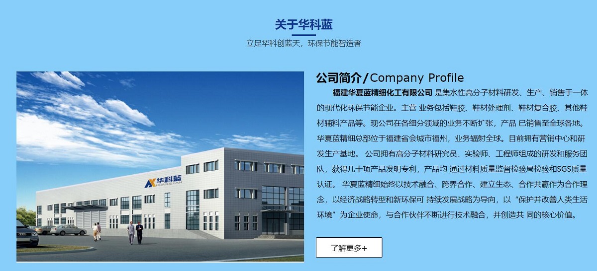 華夏藍(lán)精細(xì)總部位于福建省會(huì)城市福州,業(yè)務(wù)輻射全球網(wǎng)站建設(shè)。目前擁有營(yíng)銷(xiāo)中心和研發(fā)生產(chǎn)基地。 公司擁有高分子材料研究員、實(shí)驗(yàn)師、工程師組成的研發(fā)和服務(wù)團(tuán)隊(duì),獲得幾十項(xiàng)產(chǎn)品發(fā)明專(zhuān)利,產(chǎn)品均 通過(guò)材料質(zhì)量監(jiān)督檢驗(yàn)局檢驗(yàn)和SGS質(zhì)量認(rèn)證。