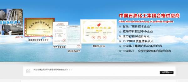 公司為山東省高新技術(shù)企業(yè),銀行信譽等級是A級,先后被當(dāng)?shù)卣谟柽B續(xù)四屆"誠信單位五十佳"、"納稅先進企業(yè)"、"勞動關(guān)系和諧企業(yè)"、"威海市科技型中小企業(yè)"等榮譽稱號。公司成立了省級“一企一技術(shù)”中心和市級工程技術(shù)研究中心,并獲得多項知識產(chǎn)權(quán)專利和省市級技術(shù)創(chuàng)新獎勵。公司為阿里誠信通會員,并為中國化工集團設(shè)備供應(yīng)商。